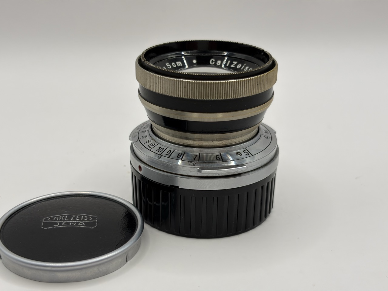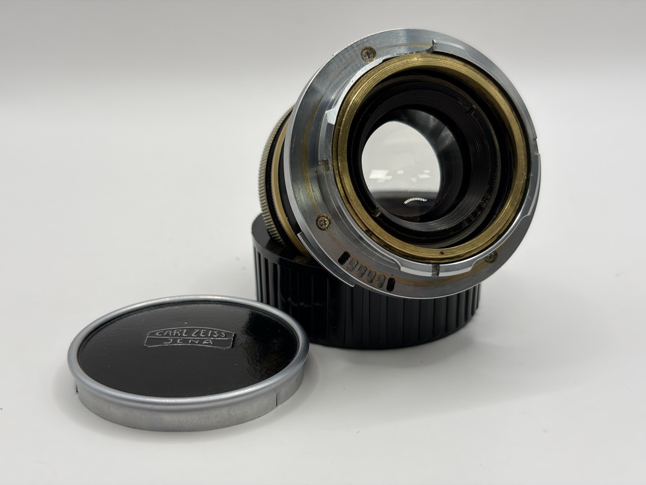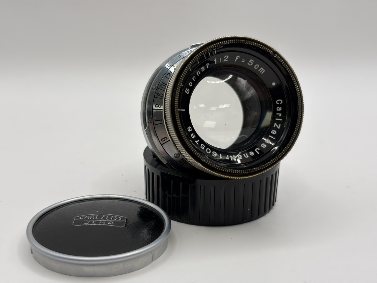 Komt met originele Zeiss voor lensdop, en een generieke Leica M achterdop.