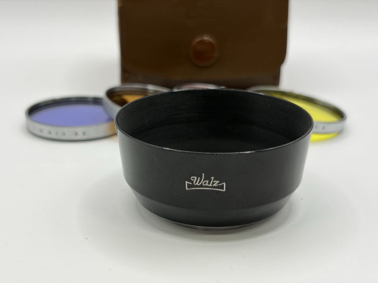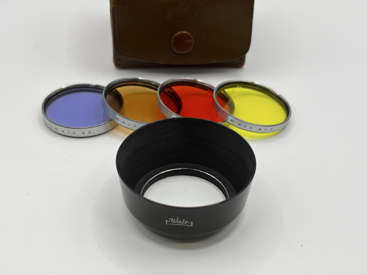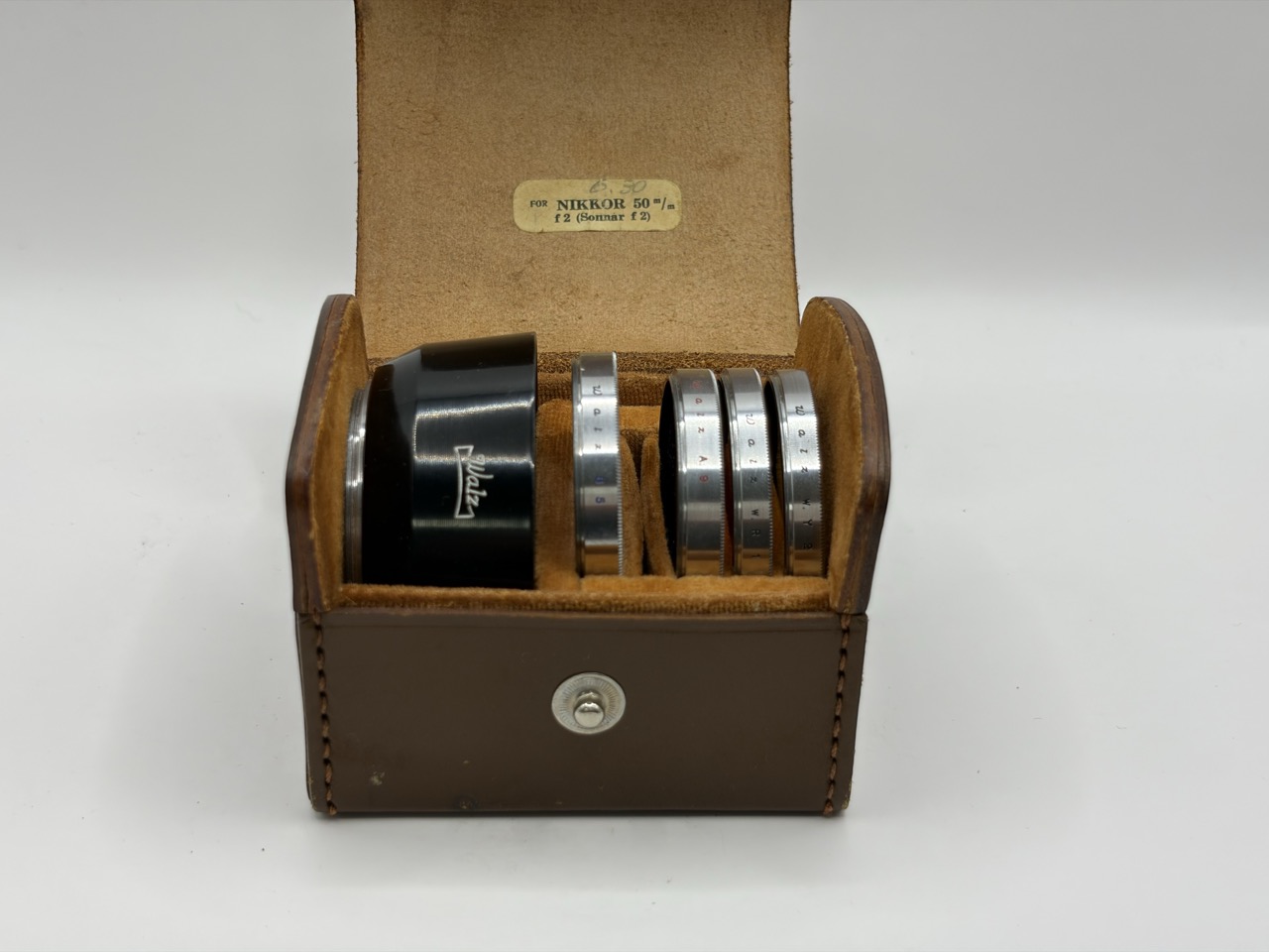 Rare Walz Lenshood + filters for Nikkor 50mm f2 Sonnar in original Casing. Very uncommon to find such a complete set.