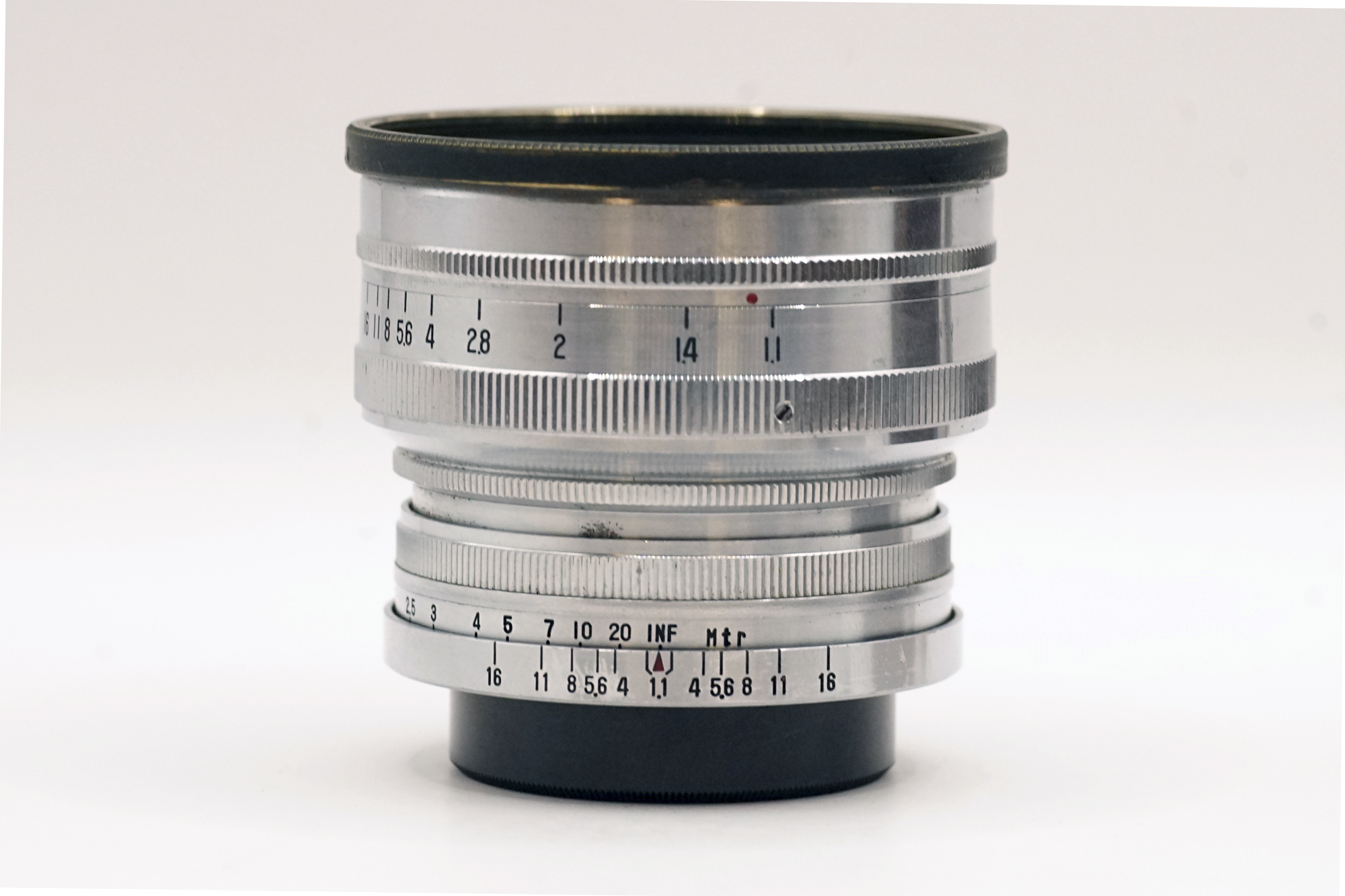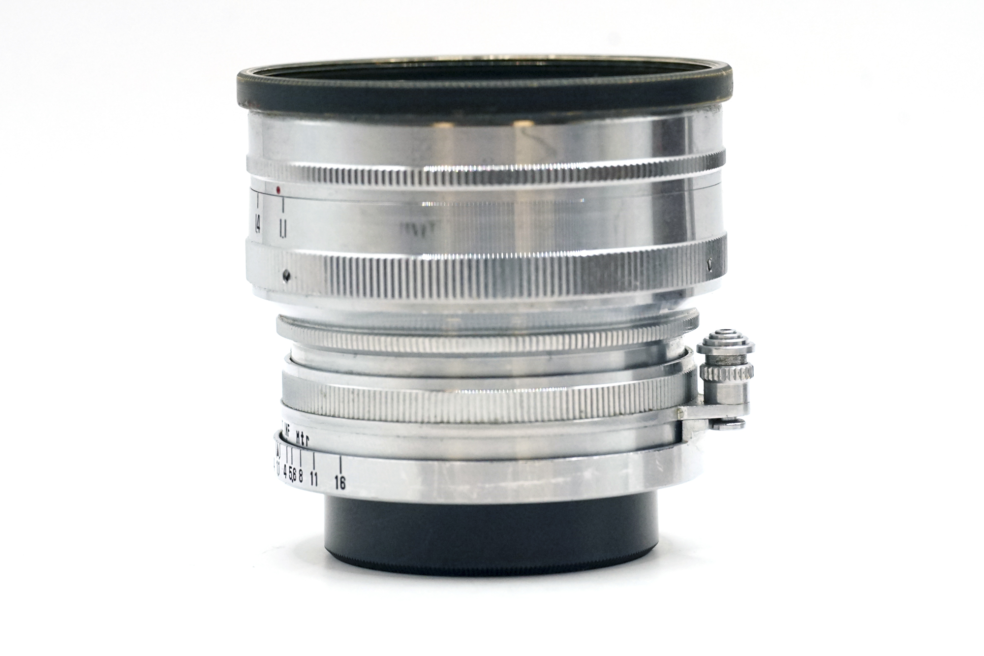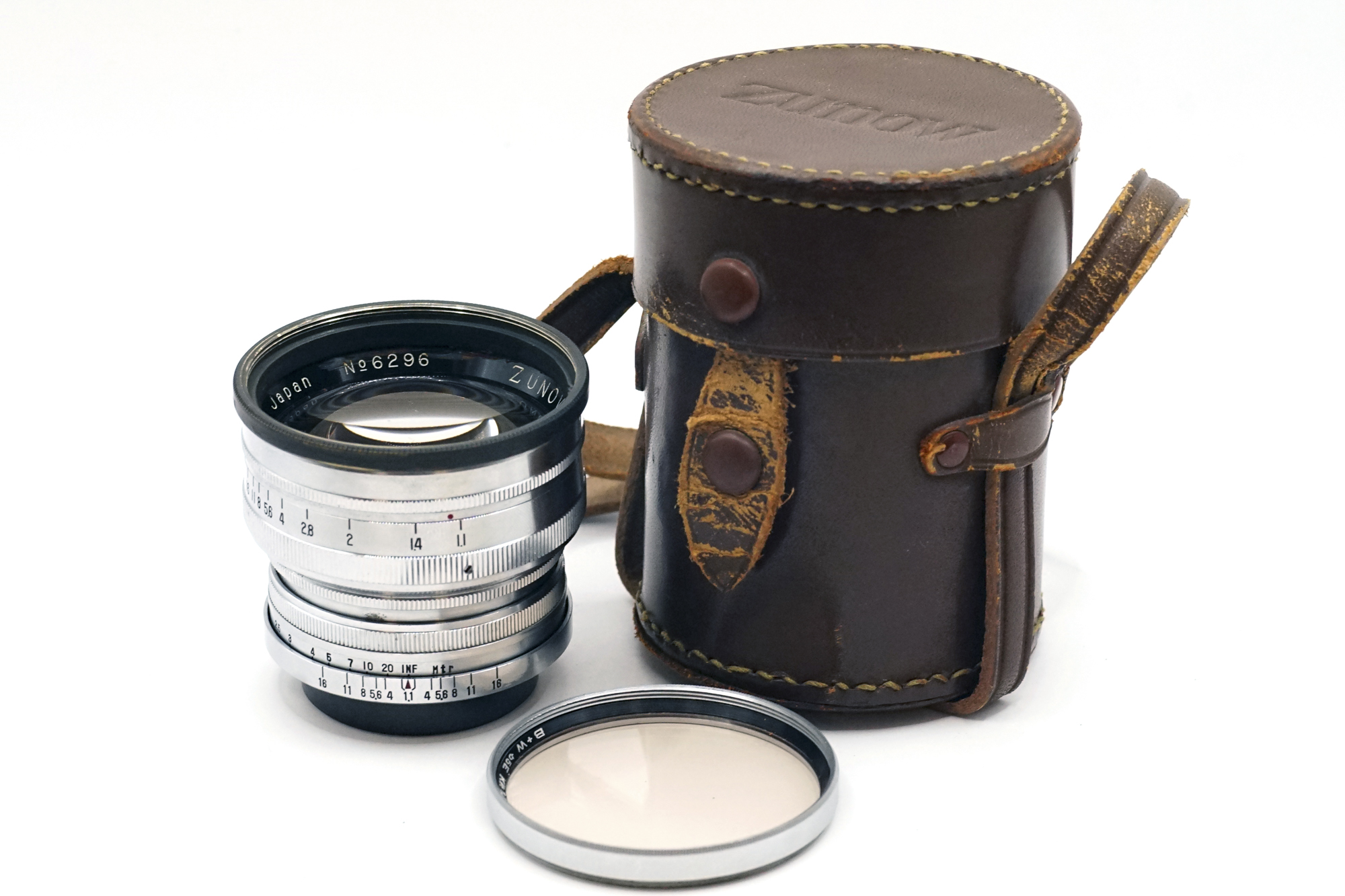Comes with original hard to find leather pouch, and a ring has been mounted to the front to be able to use a normal filter instead of impossible to find 54.5mm filters. A black metal rear cap and a vintage B&W 55mm warming filter is included.